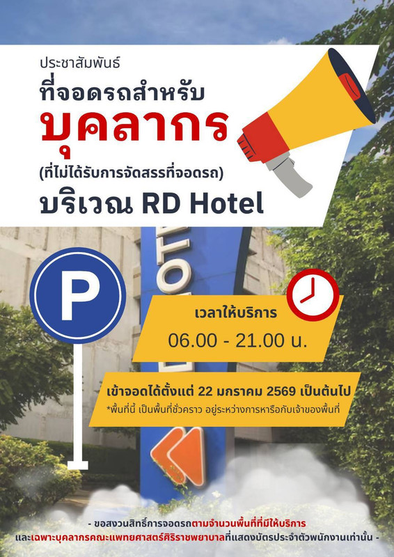 ขอประชาสัมพันธ์ที่จอดรถบริเวณ RD Hotel (*สำหรับบุคลากรที่ไม่ได้รับการจัดสรรที่จอดรถ) ตั้งแต่วันที่ 22 มค.69 เป็นต้นไป 2 กุมภาพันธ์ 2569 อ่าน 386 ครั้ง ที่จอดรถ