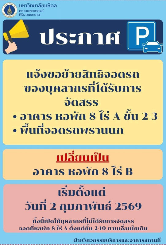 ขอประชาสัมพันธ์ การแจ้งย้ายสิทธิจอดรถ ของบุคลากรที่ได้รับการจัดสรร อาคารหอพัก 8 ไร่ A และพื้นที่จอดรถพรานนก 2 กุมภาพันธ์ 2569 อ่าน 257 ครั้ง ที่จอดรถ