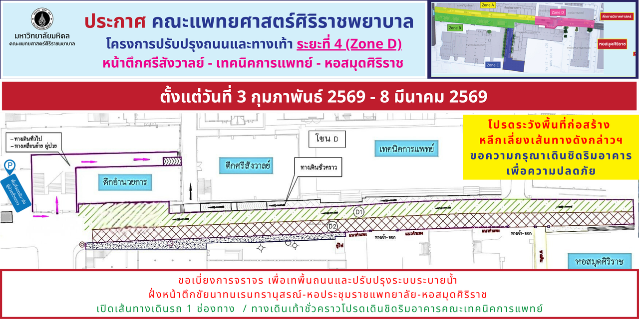 ขอประชาสัมพันธ์ ขอเบี่ยงการจราจร เพื่อเทพื้นถนนและปรับปรุงระบบระบายน้ำ ฝั่งหน้าตึกชัยนาทนเรนทรานุสรณ์ - หอประชุมราชแพทยาลัย - หอสมุดศิริราช ตั้งแต่วันที่ 3 กุมภาพันธ์ - 8 มีนาคม 2569 2 กุมภาพันธ์ 2569 อ่าน 351 ครั้ง ที่จอดรถ