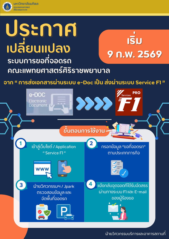 ประชาสัมพันธ์ "ประกาศเปลี่ยนแปลงระบบการขอที่จอดรถ" ของคณะแพทย์ศาสตร์ศิริราชพยาบาล (จาก e-Doc เป็น F1) 4 กุมภาพันธ์ 2569 อ่าน 410 ครั้ง ที่จอดรถ